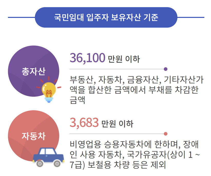 전년도 도시근로자 가구당 월평균 소득 구분 50% 70% 100% 1인가구 1,676,942원 2,347,719원 3,353,884원 2인가구 2,502,688원 3,503,763원 5,005,376원 3인가구 3,359,099원 4,702,739원 6,718,198원 4인가구 3,811,028원 5,335,439원 7,622,056원 5인가구 4,020,246원 5,628,344원 8,040,492원 6인가구 4,350,820원 6,091,147원 8,701,639원 7인가구 4,681,393원 6,553,950원 9,362,786원 8인가구 5,011,967원 7,016,753원 10,023,933원 특히, 고령자는 수급자 또는 차상위계층에 해당하는 자 중 65세 이상인자여야 합니다. 또한 영구임대주택 입주자 보유자산 기준은 2억 5,500만 원 이하여야 하며 자동차는 3,683만 원 이하여야 합니다. 또한 국민임대 입주자 보유자산 기준은 3억 6100만 원 이하여야 하며 자동차는 3,683만 원 이하여야 합니다.